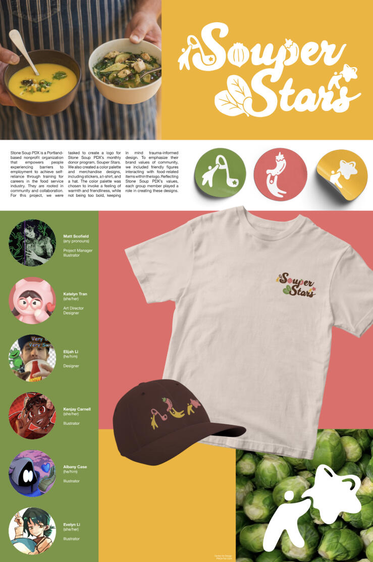 Through the PNCA Center for Design headed by Kristen Rogers Brown, Albany "LoverboyHartley" Case was part of a team of six working to collaborate with local nonprofit Stone Soup PDX to create logos and merchandise for Stone Soup's monthly donor program. The team collaborated on a bi-weekly basis and occasionally met with representatives from Stone Soup to create a welcoming and warm logo and merch while being mindful of trauma-informed design and conveying the nonprofit's core values of community and learning united by cooking.Albany's role in the project was one of the illustrators and designers. Each of the illustrators/designers were to design their own version of the logo and merchandise to put together in a pitch deck and show to the clients, to give them a variety of well-developed options. He was efficient in producing ideas for the team's art directors, and while his concepts would go unused, he contributed heavily to the overall final color palette, assisted in final logo revisions. and group discussions regarding creative decision-making. After the logo was decided on, Albany spent time working on stickers and merchandise ideas for the rest of the project's duration.