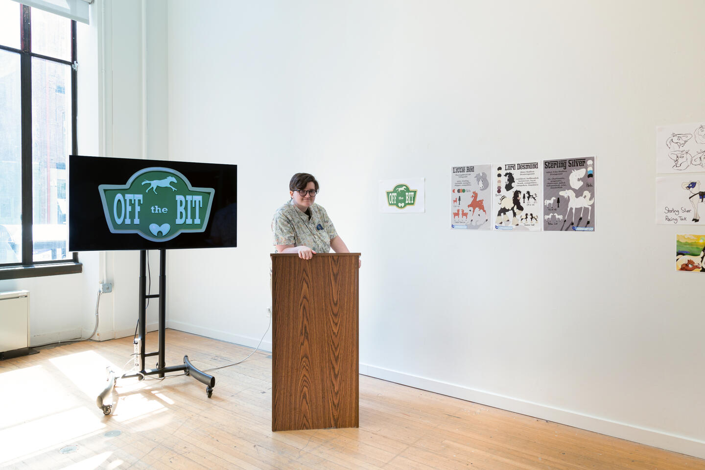 When it came to his thesis year at PNCA, Albany "LoverboyHartley" Case had to demonstrate everything he'd learned and had too many ideas and messages to do it with. In the latter part of his third year, though, he became very interested in horses, and chose to use that new interest as inspiration for his thesis, which he had already wanted to be an authentic queer narrative. This would take the form of a pitch bible for a hypothetical animated film which aimed to tell a positive queer story with a happy ending, directed at a general audience. This queer story would be accessible to all ages and had the goal of trying to remove queer stories from a label of being "adult content". With this, the foundation was laid, and Albany would combine his newfound appreciation for horses, his desire to tell unapologetic stories of men who love men, and his background living in the country to create Off the Bit.Albany mentored under illustrator Zach Meyer and proposed a pitch bible containing three character designs and reference sheets, the script for one scene, three backgrounds, a logo, sticker merchandise, an illustrated scene, miscellaneous illustrations and all the concept art that came with the project. The project was presented in its finished form in the spring of 2025 after almost two years of production and Albany considers it one of if not the strongest example of his capabilities as an artist and designer.