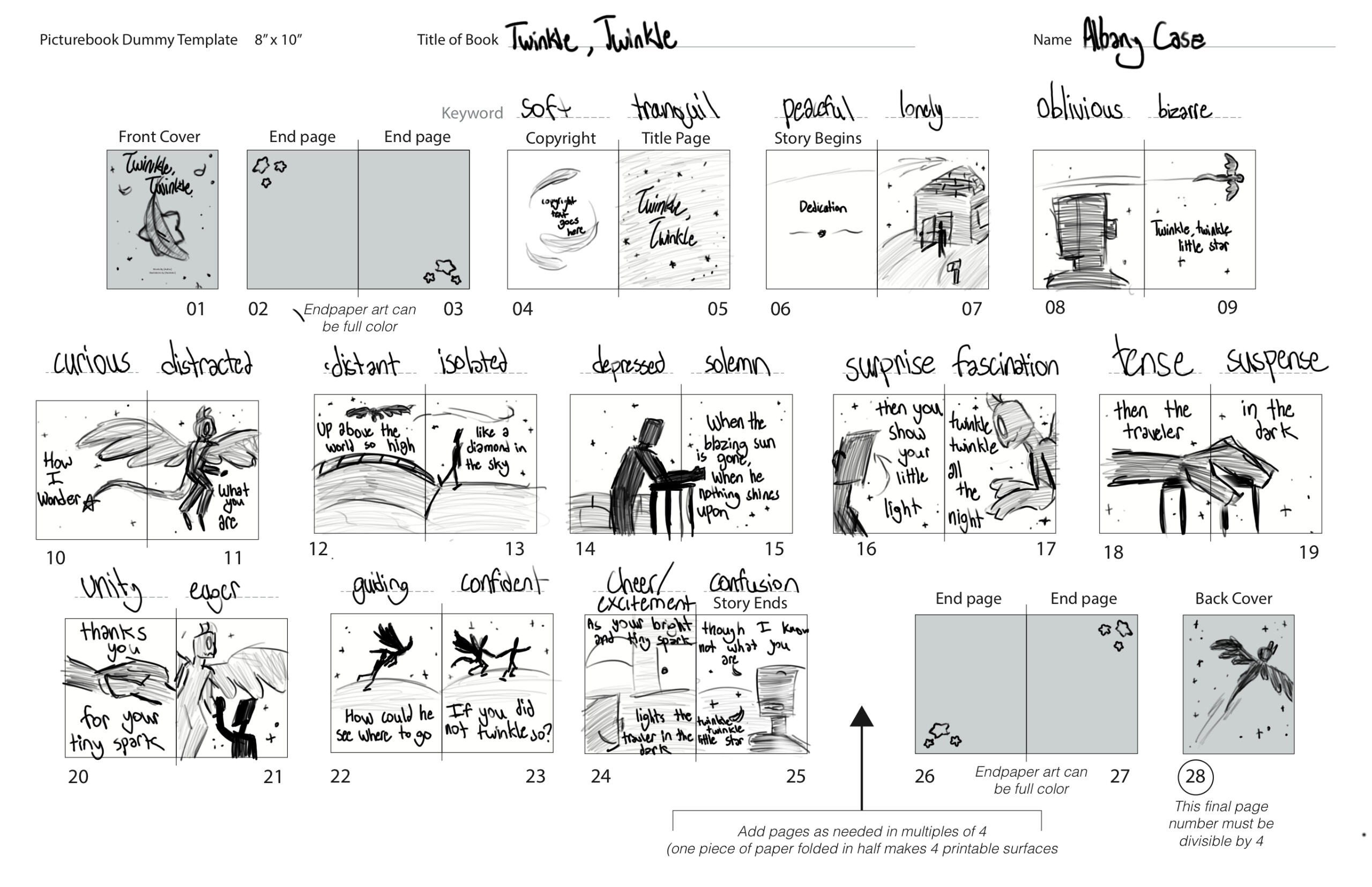Created in PNCA's Picture Book 1 course, taught by David Hohn, "Twinkle, Twinkle" was an experimental exploration by Albany "LoverboyHartley" Case into the world of picture book illustration. Adapted from the famous nursery song "Twinkle, Twinkle, Little Star", this 28 page book tells the quiet story of a lonely individual setting out at night to contemplate taking their own life, when the personification of a twinkling star comes down from the sky to guide them back home. Albany wrote from a personal perspective when it came to his own experience with self-destructive intrusive thoughts and finding the hope it takes to keep living.Creating the book dummy was a hard lesson to learn for Albany, who was struggling managing a heavy school load at the time from other classes, but the project became a point of pride later on, for creating something entirely out of his wheelhouse from the ground up and managing stressors and the feedback of his instructor. Though the book itself had a fraught production, Albany finds it taught him a lot about being an illustrator, not just for picture books, and exists as an example of the rapid growth he experienced between his last two years at PNCA.